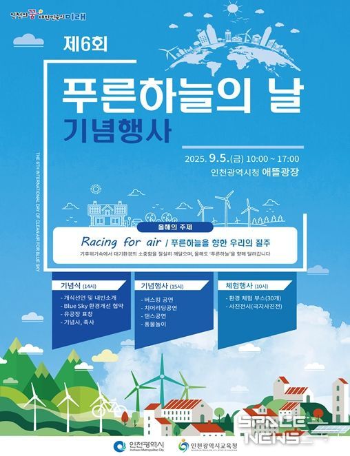 스페이스뉴스 스페이스뉴스 기자 | 인천광역시는 9월 5일 오전 10시부터 오후 5시까지 시청 애뜰광장에서 ‘푸른하늘을 위한 국제 맑은 공기의 날’을 맞아 제6회 기념행사를 개최했다고 밝혔다.