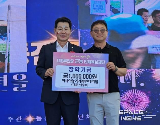 스페이스뉴스 스페이스뉴스 기자 | 부안군 근농인재육성재단은 지난 6일에 열린 제9회 동진면민의 날 행사에서 아세아농기계 부안대리점이 지역인재 육성을 위한 장학금 100만원을 기탁했다고 밝혔다.