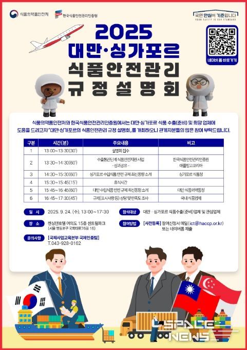 스페이스뉴스 스페이스뉴스 기자 | 식품의약품안전처와 한국식품안전관리인증원은 국내 식품기업의 해외 진출을 지원하기 위해 오는 9월 24일 켄싱턴호텔 여의도(서울특별시 영등포구 소재)에서 ‘대만·싱가포르 식품안전 규정 설명회’를 개최한다고 밝혔다.