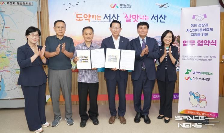 스페이스뉴스 스페이스뉴스 기자 | 서산문화재단과 ㈜에프엔바이오는 9월 8일 오후, 서산시청 시장실에서 업무협약 및 기탁식을 열고 서산해미읍성축제 지원을 위한 상생 협력을 약속했다.