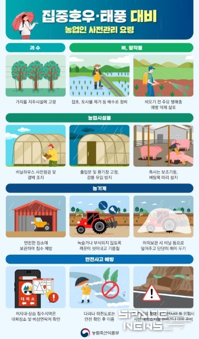 농식품부는 농업재해대책 상황실을 중심으로 농진청, 산림청, 지자체, 농어촌공사, 농협 등 재난대응 기관과 공조체계를 유지하고, 24시간 재해대응 상황을 관리하면서 농업인 인명사고와 재산피해 최소화를 위해 총력 대응할 계획이다.