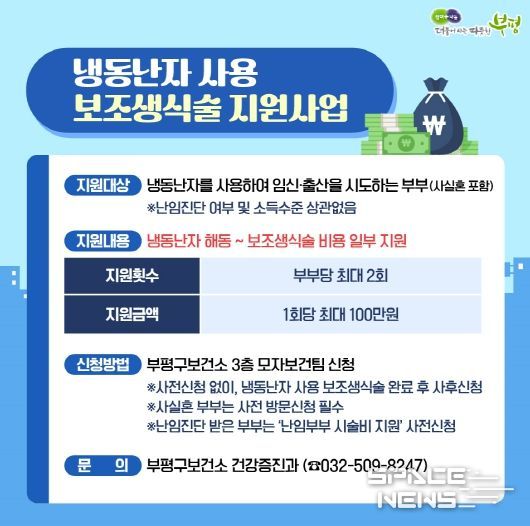 스페이스뉴스 스페이스뉴스 기자 | 부평구는 아이를 원하는 부부의 임신·출산을 적극적으로 지원하기 위해 ‘냉동 난자 사용 보조생식술 지원사업’을 진행한다고 12일 밝혔다.