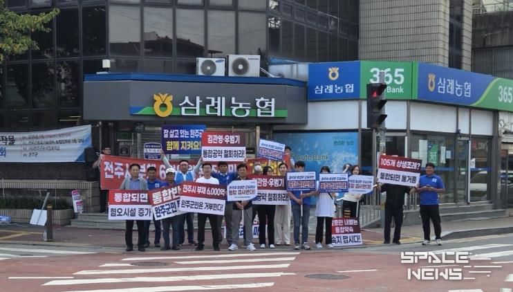 스페이스뉴스 스페이스뉴스 기자 | 완주군의회 유의식 의장과 이경애 의원이 15일 오전 삼례농협 일원에서 출근길 주민을 대상으로 완주-전주 통합 반대 캠페인을 벌이며 강력한 반대 의지를 밝혔다.