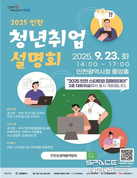 스페이스뉴스 스페이스뉴스 기자 | 인천광역시는 오는 9월 23일 시청 중앙홀에서 ‘2025 인천 청년 취업설명회’를 개최한다고 밝혔다. 이번 행사는 청년들에게 공기업·민간기업·신생기업(startup) 등 다양한 취업 기회를 제공하기 위해 마련됐다.