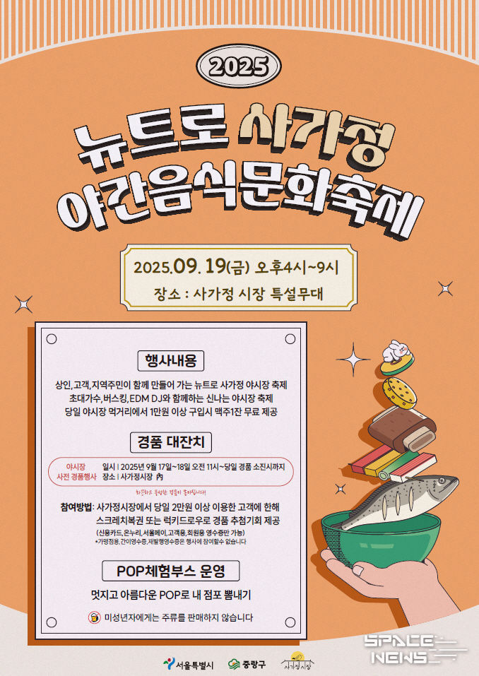 스페이스뉴스 스페이스뉴스 기자 | 서울 중랑구의 대표 전통시장인 사가정시장이 9월 19일(목) 오후 4시부터 9시까지 ‘뉴트로 사가정 야간음식문화축제’를 개최한다. 이번 축제는 사가정시장이 주최하고 서울시와 중랑구청이 후원하며 (주)시장통이 수행기관으로 참여한다.