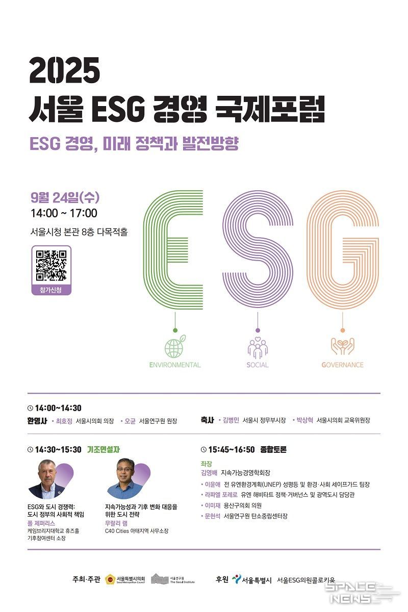 스페이스뉴스 스페이스뉴스 기자 | 서울연구원(원장 오균)은 9월 24일 오후 2시부터 서울시청 본청 8층 다목적홀에서 ‘ESG 경영, 미래 정책과 발전방향’을 주제로 서울특별시의회와 서울연구원이 공동주최하고, 서울특별시와 서울ESG의원콜로키움이 후원하는 제3회'2025 서울 ESG 경영국제포럼'을 개최한다.