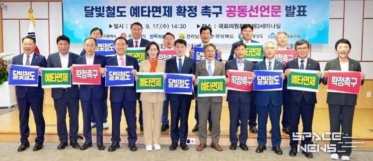 스페이스뉴스 스페이스뉴스 기자 | 강기정 광주광역시장이 달빛철도가 경유하는 영·호남 시·도지사, 지역 국회의원들과 17일 국회에서 ‘달빛철도 예비타당성조사 면제 확정을 촉구하는 공동선언’을 발표했다.