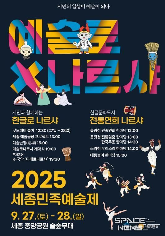 스페이스뉴스 스페이스뉴스 기자 | 세종특별자치시가 주최하고 한국민족예술단체총연합회 세종지회가 주관하는 2025 세종민족예술제 ‘예술로 나르샤’가 오는 27∼28일 이틀간 세종중앙공원 솔숲 무대에서 펼쳐진다.