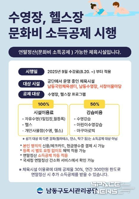 스페이스뉴스 스페이스뉴스 기자 | 인천시 남동구 도시관리공단은 공공 체육시설 수영장 및 헬스장 이용료에 대한 문화비 소득공제 혜택을 제공한다고 18일 밝혔다.