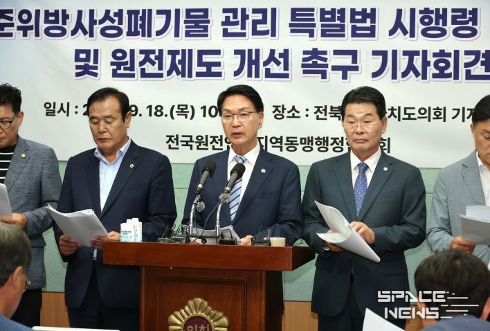 스페이스뉴스 스페이스뉴스 기자 | 심덕섭 고창군수가 18일 오전 전북특별자치도 도의회 브리핑룸에서 열린 전국원전인근지역동맹 행정협의회 공동 기자회견에 참여해 “시행을 앞둔 고준위핵폐기물 임시저장시설 설치를 골자로 한 ‘특별법 시행령’에 깊은 유감을 표하며 원전과 관련된 불합리한 법령 및 제도를 개선할 것”을 촉구했다.