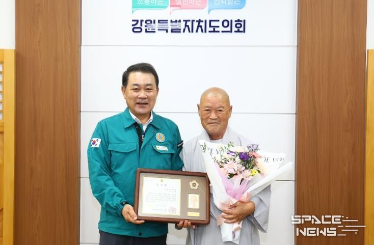 스페이스뉴스 스페이스뉴스 기자 | 강원특별자치도의회는 9월 18일, 강원특별자치도의회에서 지역사회 봉사와 종교․문화 발전에 기여한 공로로 원주지역의 현각스님(원주 성불원 주지)에게 감사패를 전달했다.