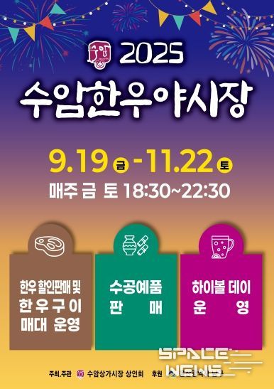 스페이스뉴스 스페이스뉴스 기자 | 울산 남구는 행정안전부 공식 지정 야시장인‘수암한우야시장’ 이 하반기 개장에 들어가 19일부터 11월 22일까지 매주 금·토 오후 6시 30분부터 10시 30분까지 총 16회 운영된다고 밝혔다.