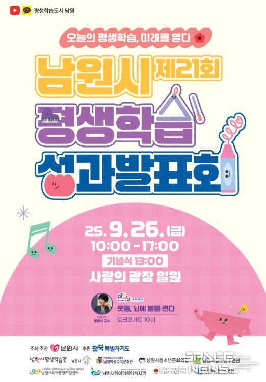 스페이스뉴스 스페이스뉴스 기자 | 남원시은 오는 26일 사랑의 광장에서 ‘오늘의 평생학습, 미래를 열다’를 주제로 제21회 남원시 평생학습 성과발표회를 개최한다.