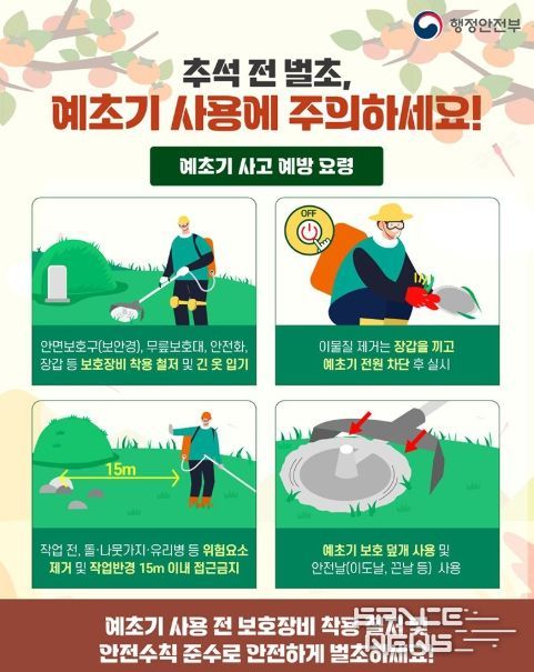 예초기 사용 전 보호장비 착용 철저 및 안전수칙 준수로 안전하게 벌초하세요!
