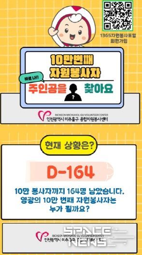 스페이스뉴스 스페이스뉴스 기자 | 인천 미추홀구종합자원봉사센터(센터장 유중형)는 지역 사회 자원봉사 활성화를 위해 ‘10만 번째 자원봉사자를 찾아라!!’ 이벤트를 진행한다고 22일 밝혔다.