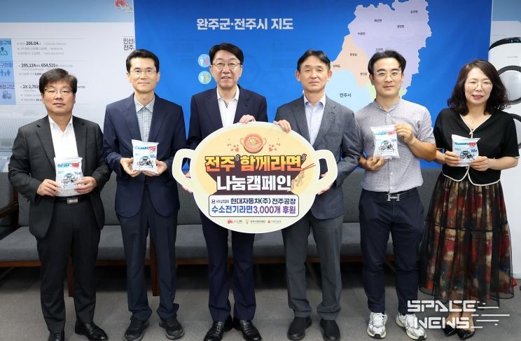 스페이스뉴스 스페이스뉴스 기자 | 현대차동차 전주공장(공장장 장현구)은 22일 전주시장실을 찾아 전주시가 중점 추진 중인 ‘전주함께라면’ 복지사업에 힘을 보태기 위해 수소전기라면 3000개를 전달했다.
