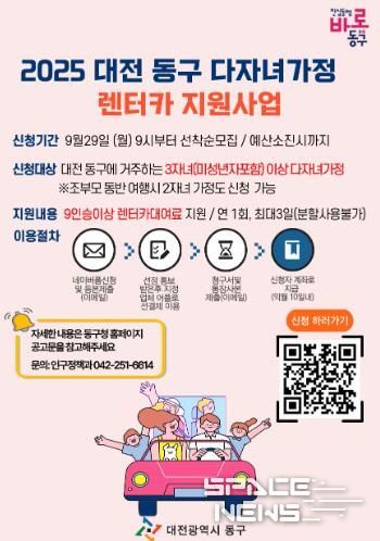 스페이스뉴스 스페이스뉴스 기자 | 대전 동구는 다자녀 가정의 여가활동 지원과 아이 키우기 좋은 환경 조성을 위해 ‘2025년 다자녀 가정 렌터카 지원사업’을 본격 추진, 이달 29일부터 참여자를 모집한다고 밝혔다.