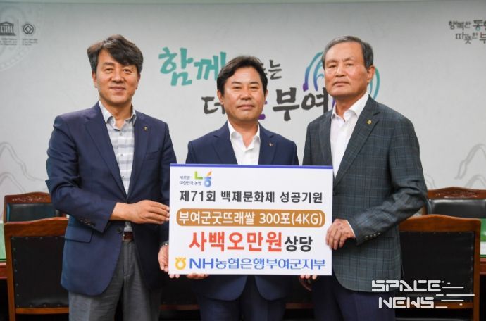 스페이스뉴스 스페이스뉴스 기자 | 부여군은 지난 9월 22일 군수실에서 제71회 백제문화제의 성공적인 개최를 기원하는 NH농협은행 부여군지부(지부장 류경환) 기부금 전달식을 진행했다.