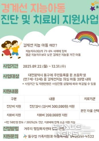 스페이스뉴스 스페이스뉴스 기자 | 대전 동구는 경계선지능아동(느린학습자)이 건강한 사회구성원으로 성장하고 자립할 수 있도록, 고향사랑기금을 활용한 ‘경계선지능아동 검사 및 치료비 지원사업’을 본격 추진한다고 24일 밝혔다.
