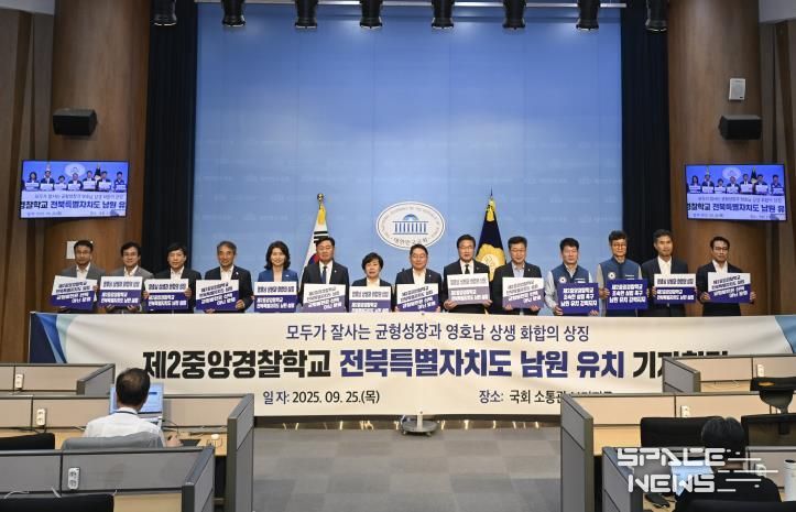 스페이스뉴스 스페이스뉴스 기자 | 전북특별자치도 국회의원과 전북 연고 및 영호남 국회의원들이 9월 25일 오전 국회 소통관 브리핑룸에서 '제2중앙경찰학교 전북특별자치도 남원 유치 촉구 기자회견'을 가졌다.