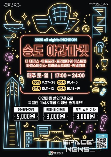 스페이스뉴스 스페이스뉴스 기자 | 인천광역시와 인천관광공사(사장 백현)는 9월 27일부터 10월 19일까지 매주 토·일 4주간 송도 일대 6개 상권에서 풍성한 할인혜택과 더불어 상권별 다양한 행사를 즐길 수 있는‘2025 all nights INCHEON 송도 야간마켓’을 개최한다고 밝혔다.
