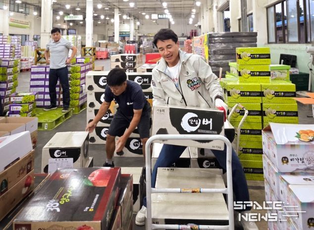 김 지사는 낙찰된 과일 상자를 손수레에 싣고 중도매인 점포까지 직접 운반하기도 했다.