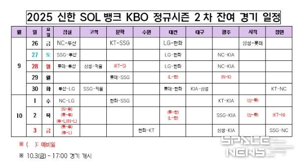 스페이스뉴스 스페이스뉴스 기자 | KBO는 26일(금) 2025 신한 SOL뱅크 KBO 정규시즌 2차 잔여 경기 일정을 확정했다.