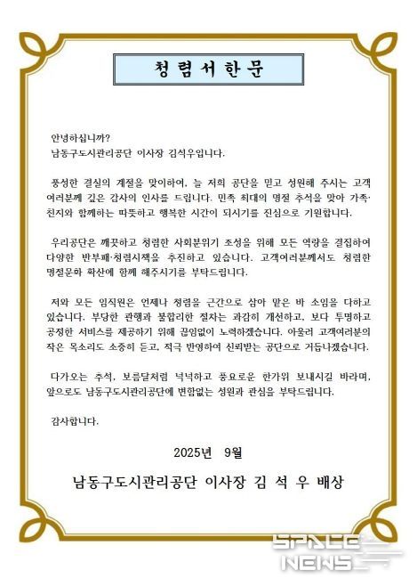 스페이스뉴스 스페이스뉴스 기자 | 인천시 남동구 도시관리공단은 청렴 문화 정착을 위해 공사, 용역, 물품 관련 업체와 전 직원에게 ‘청렴 서한문’을 발송했다고 29일 전했다.