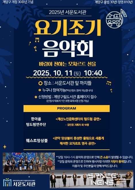 스페이스뉴스 스페이스뉴스 기자 | 인천 계양구 서운도서관은 오는 10월 11일 오전 10시 40분, 서운도서관 야외공원(까치뜰)에서 요기조기 음악회 ‘바람이 전하는 모차르트 선율’을 개최한다.