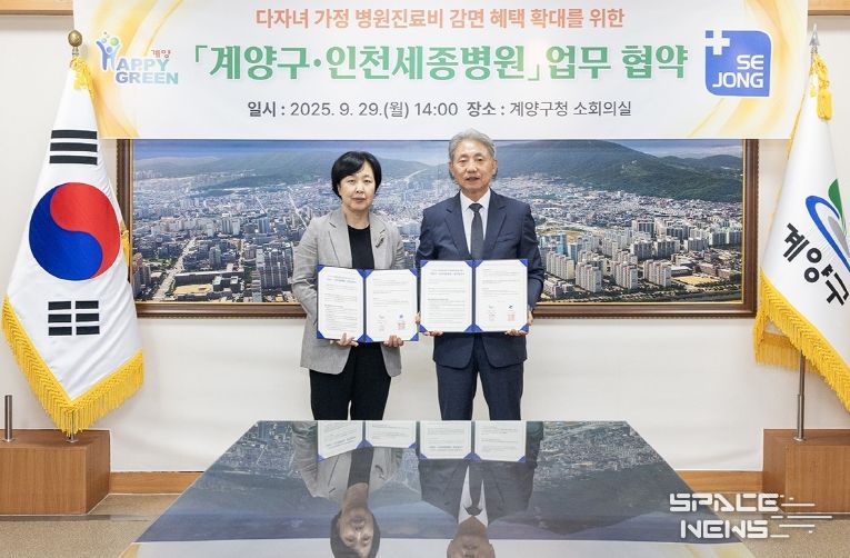 스페이스뉴스 스페이스뉴스 기자 | 인천광역시 계양구는 9월 29일 인천세종병원(병원장 오병희)과 ‘다자녀 가정 병원진료비 감면 확대’를 위한 업무협약을 체결했다.
