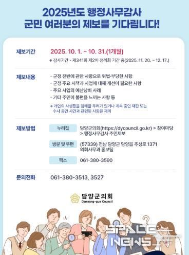 스페이스뉴스 스페이스뉴스 기자 | 담양군의회는 2025년 행정사무감사를 앞두고 ‘행정사무감사 주민제보’ 접수를 첫 시행 한다고 밝혔다.