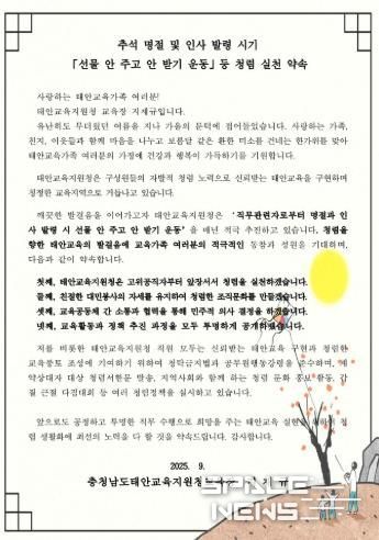 스페이스뉴스 스페이스뉴스 기자 | 충청남도태안교육지원청은 추석 연휴 시기를 맞아 청렴한 공직문화를 확산하기 위해 ‘선물 안 주고 안 받기 운동’을 강조하는 청렴 서한문을 홈페이지에 게시했다.