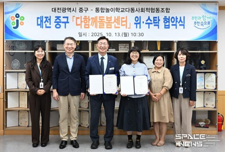 스페이스뉴스 스페이스뉴스 기자 | 대전 중구는 13일 통합놀이학교다동 사회적협동조합(대표 이미라)과 다함께돌봄센터 석교1호점 위수탁 운영협약을 체결했다고 밝혔다.
