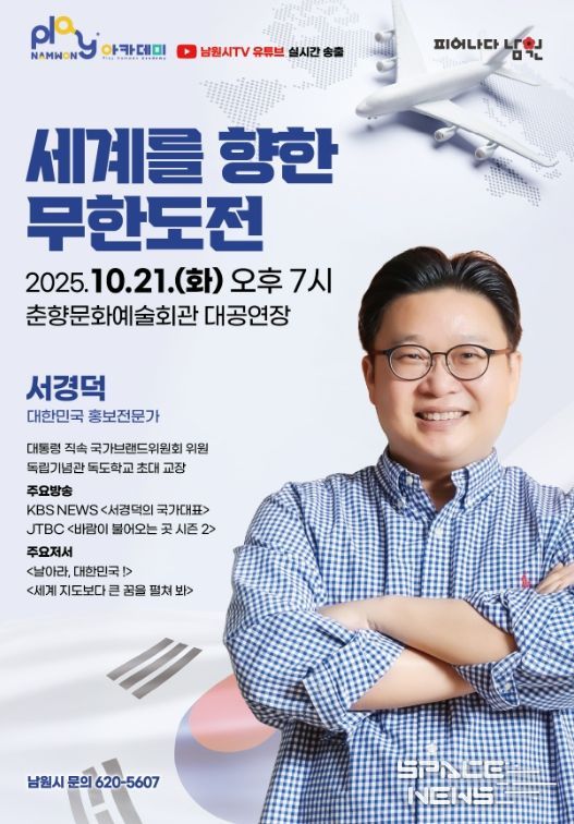 스페이스뉴스 스페이스뉴스 기자 | 남원시는 오는 21일 오후 7시, 춘향문화예술회관 대공연장에서 대한민국 홍보 전문가 서경덕 교수를 초청해 “세계를 향한 무한도전”이라는 주제로 플레이(Play) 남원 아카데미를 개최한다.