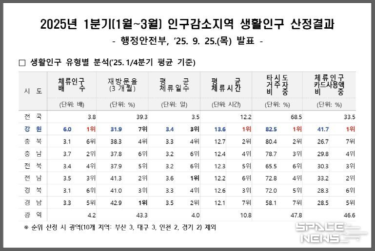 스페이스뉴스 스페이스뉴스 기자 | 강원특별자치도는 행정안전부가 9월 25일 발표한 ‘2025년 1분기 인구감소지역 생활인구 산정 결과’에서 체류인구 총 2,826,012명으로 전국 최고 수준을 기록했다고 밝혔다.
