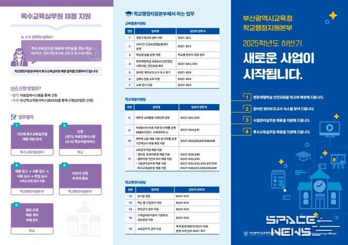 부산광역시교육청학교행정지원본부는 2025학년도 하반기부터 확대 시행되는 학교 지원 신규 사업 4가지를 소개하는 홍보 리플릿을 제작해 부산 관내 모든 학교에 배포한다고 14일 밝혔다.