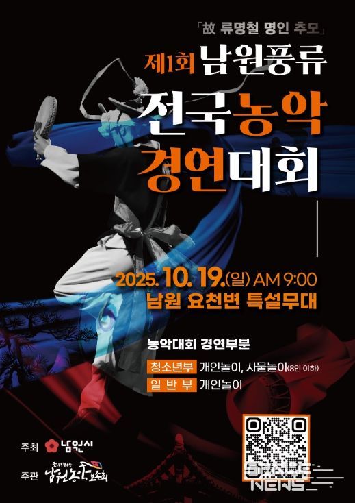 스페이스뉴스 스페이스뉴스 기자 | 고(故) 류명철 명인을 추모하고 남원농악의 전통을 전국적으로 확산하기 위한 ‘제1회 남원풍류 전국농악경연대회’가 오는 10월 19일, 남원시 요천변 특설무대에서 열린다.