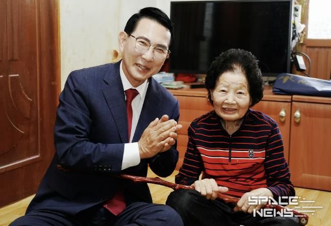 스페이스뉴스 스페이스뉴스 기자 | 이완섭 서산시장이 지난 14일 올해 100세를 맞이한 어르신에게 장수를 기원하는 지팡이 ‘청려장’을 전달했다.