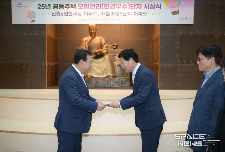 스페이스뉴스 스페이스뉴스 기자 | 세종특별자치시가 15일 시청 한글사랑세종책문화센터에서 열린 2025년 공동주택 모범관리(인권우수)단지 시상식에서 신흥e편한세상·새뜸마을5단지 등 2개 단지에 인증패를 수여했다.