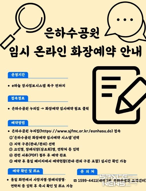 스페이스뉴스 스페이스뉴스 기자 | 세종특별자치시시설관리공단은 국가정보자원관리원 화재로 'e하늘 장사정보시스템'이 마비됨에 따라, 시민 불편을 최소화하기 위해 은하수공원 임시 화장예약 시스템을 구축해 운영한다고 밝혔다.