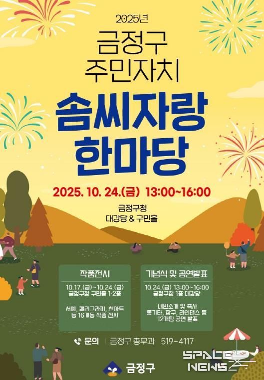 스페이스뉴스 스페이스뉴스 기자 | 부산시 금정구는 10월 17일부터 10월 26일까지 금정구청 대강당과 구민홀에서 ‘2025년 금정구 주민자치 솜씨자랑 한마당’을 개최한다고 17일 밝혔다.