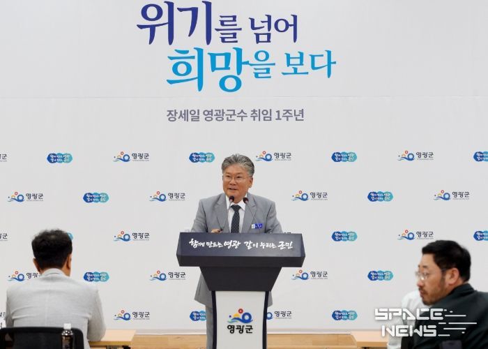 스페이스뉴스 스페이스뉴스 기자 | 영광군은 21일 군청 대회의실에서 장세일 영광군수 취임 1주년을 맞아 기자단, 부군수, 실·단·과·소장 등 100여 명이 참석한 가운데 ‘취임 1주년 기자회견’을 개최했다. 이번 기자회견은 지난 1년간의 군정 성과와 향후 군정 운영 방향을 공유하고 언론과의 소통을 강화하기 위해 마련됐다.