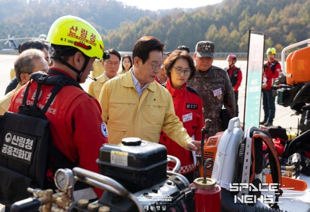이 대통령은 먼저 강원 원주시에 위치한 산림청 산림항공본부를 찾아 산림청과 군(軍)의 산불 진화 헬기, 드론, 차량 등 핵심 장비를 점검했다.
