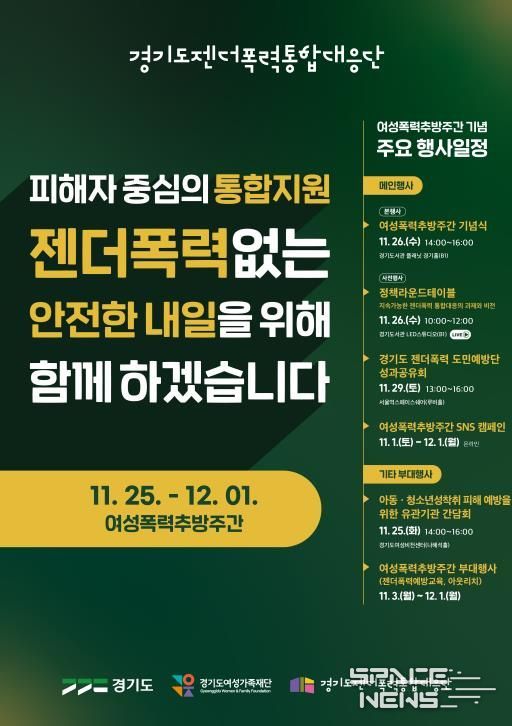 스페이스뉴스 스페이스뉴스 기자 | 경기도와 경기도여성가족재단 젠더폭력통합대응단은 여성폭력추방주간(11월 25일~12월 1일)을 맞아 도민과 함께하는 다양한 행사를 추진한다고 13일 밝혔다.