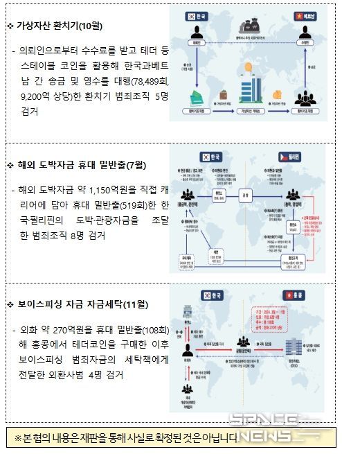① (불법송금) 환치기는 대표적인 불법 자금 유통·은닉 방식으로, 지난 5년간 관세청이 단속된 환치기 범죄 규모는 약 11조 원을 넘는다. 특히 가상자산 활용 비율은 83%에 달할 정도로 익명성을 악용한 단속 회피 시도가 빈번한 상황이다.