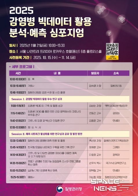 스페이스뉴스 스페이스뉴스 기자 | 질병관리청은 11월 21일 '2025 감염병 빅데이터 활용 분석·예측 심포지엄'을 개최하고, 연구성과를 공유하며 향후 데이터 기반 정책 고도화 방안을 논의한다.