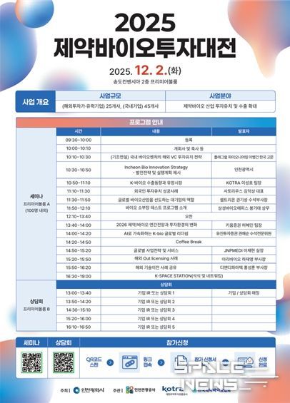 스페이스뉴스 스페이스뉴스 기자 | 인천광역시가 주최하고 인천관광공사와 KOTRA, 한국제약바이오협회가 공동 주관하는 ‘제약바이오투자대전’이 오는 12월 2일 인천 송도컨벤시아 프리미어볼룸에서 열린다.