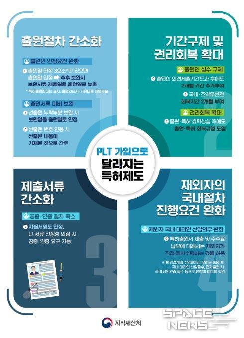 스페이스뉴스 스페이스뉴스 기자 | 2029년 특허법 조약 가입으로 기존 한국어, 영어 외에 모든 언어를 사용한 특허출원이 가능해진다. 또한 인감증명서 없이 자필서명만으로 특허권 이전이 가능해지는 등 공증·인증절차가 완화된다.