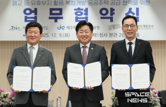 제주특별자치도와 제주도교육청, 제주도개발공사는 9일 도청 삼다홀에서 폐교 등 유휴부지 활용 복합개발 공공주택 공급 협력을 위한 업무협약을 체결했다.