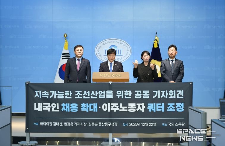 스페이스뉴스 스페이스뉴스 기자 | 변광용 거제시장은 지난 22일 김태선 국회의원(울산동구, 환경노동위), 김종훈 울산 동구청장과 함께 국회 소통관에서 기자회견을 열고, ‘조선산업기본법’ 제정, 내국인 채용 확대, 외국인 쿼터 축소를 골자로 한 고용구조 전환의 필요성을 정부에 촉구했다.